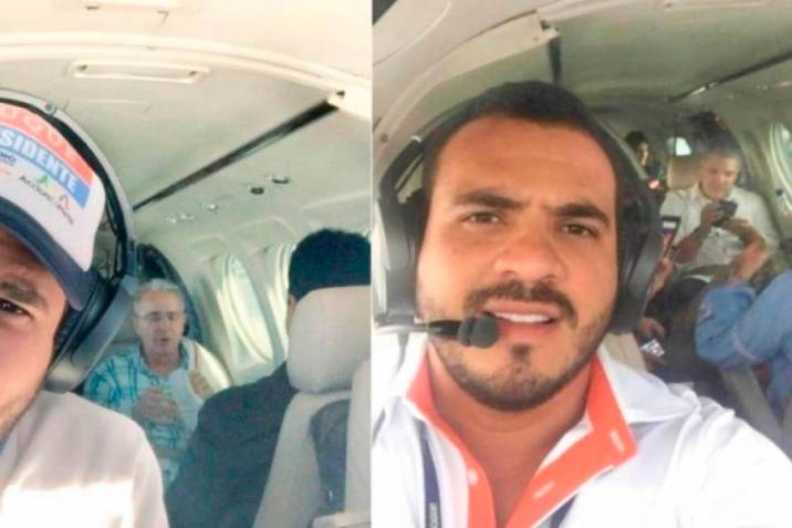 Juan Camilo Cadena Botero, aviador que transportaba media tonelada de cocaína capturada en Providencia, fue piloto de Álvaro Uribe en un vuelo a Puerto Lleras, Meta, en 2018, junto con Nohora Stella Tovar, exsenadora del Centro Democrático y candidata en 2019 a la gobernación del Meta. Foto tomada por Hernán Gómez Niño (izquierda), hermano del piloto de cartel de Sinaloa que transportó en esa misma campaña a Uribe y a Iván Duque.