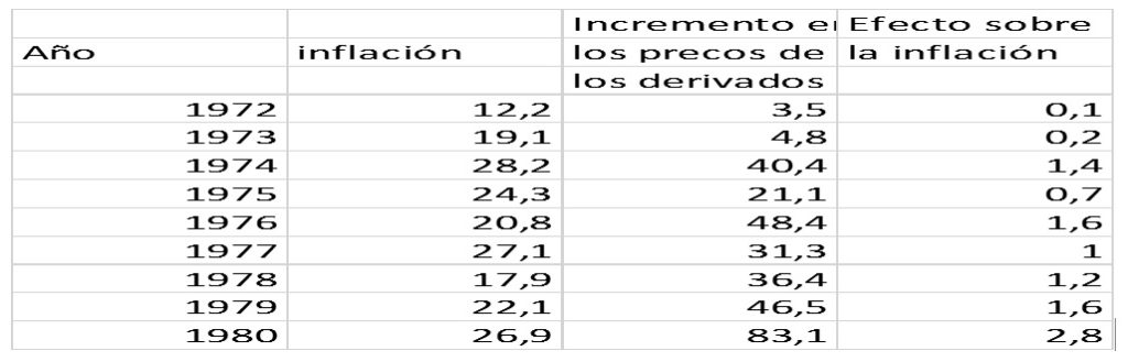 La conclusión de este estudio muestra que el impacto sobre la inflación doméstica no fue muy grande, representando menos del 10% de la tasa de inflación y no mayor a dos puntos, excepto en 1980. Claramente, el impacto depende del tamaño del aumento de los precios de los derivados.