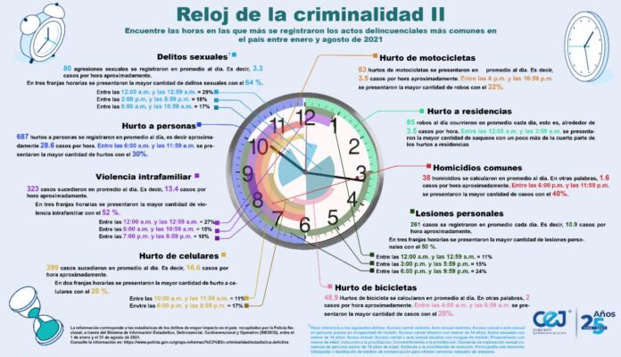 En atención a los hechos de inseguridad que han ocurrido recientemente en Bogotá y en varias ciudades y regiones del país, la Corporación Excelencia en la Justicia —CEJ— presentó el Reloj de la Criminalidad II, que establece las horas en las que se cometieron los delitos de mayor impacto en Colombia en lo corrido de este año (con corte al 31 de agosto). La CEJ extrajo cifras del Sistema de Información Estadístico, Delincuencial, Contravencional y Operativo (SIEDCO) de la Policía Nacional con las cuales realizó análisis metodológicos y estadísticos para crear esta herramienta que servirá a las autoridades en su tarea encarar los actos delincuenciales.