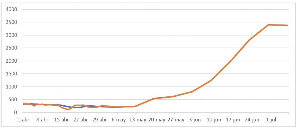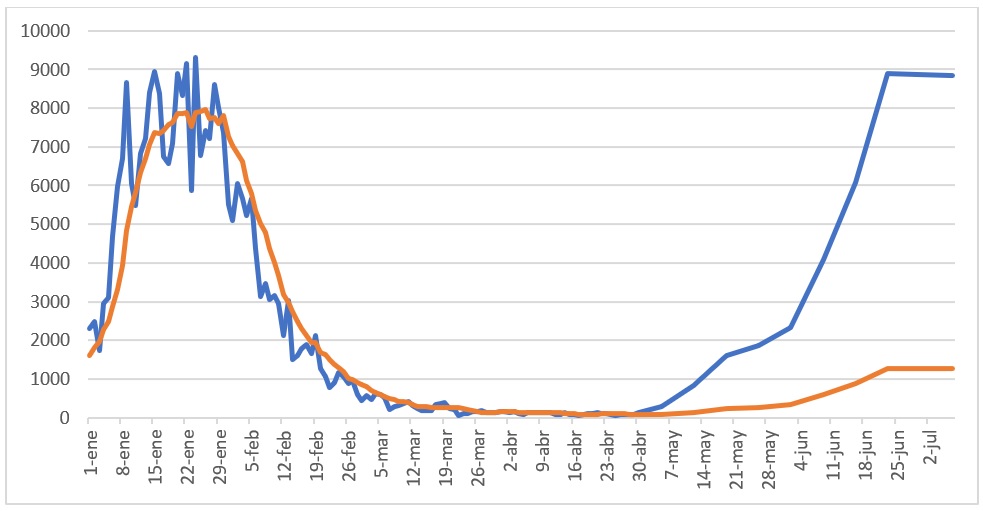 En el gráfico 3 hay dos curvas: la azul se refiere a los casos diarios reales y la naranja el promedio diario de siete días. Obsérvese que a partir del 30 de mayo la curva azul representa el total de infectados por semana y la azul el promedio diario.