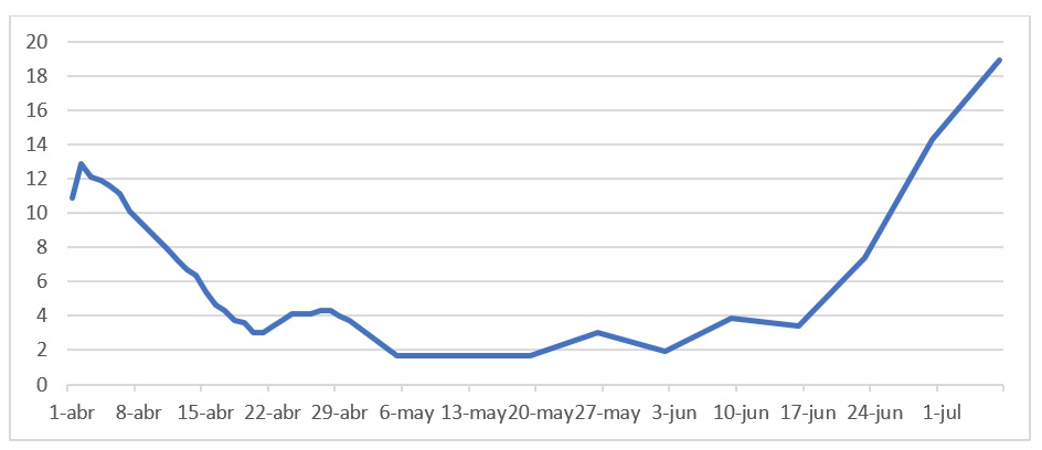 La quinta ola comenzó el 6 de mayo y en la semana del 1-7 de julio alcanzaba 1264 infectados diarios.