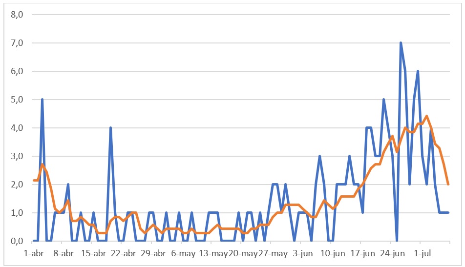 De la semana del 20 al 26 de mayo se inició el crecimiento de los muertos diarios de la quinta ola con promedio diario de 3 que aumentó a 19 en la semana del 1-7 de julio (gráfico 2).