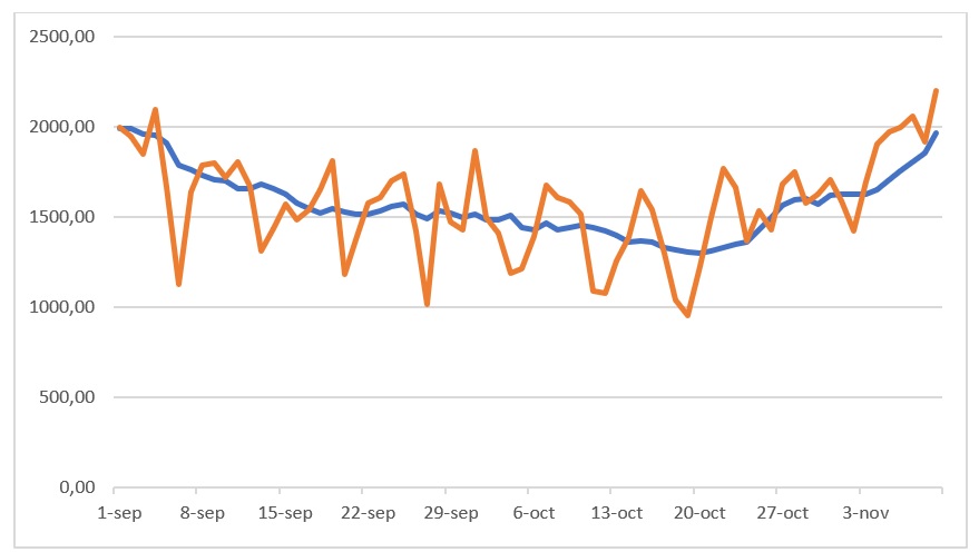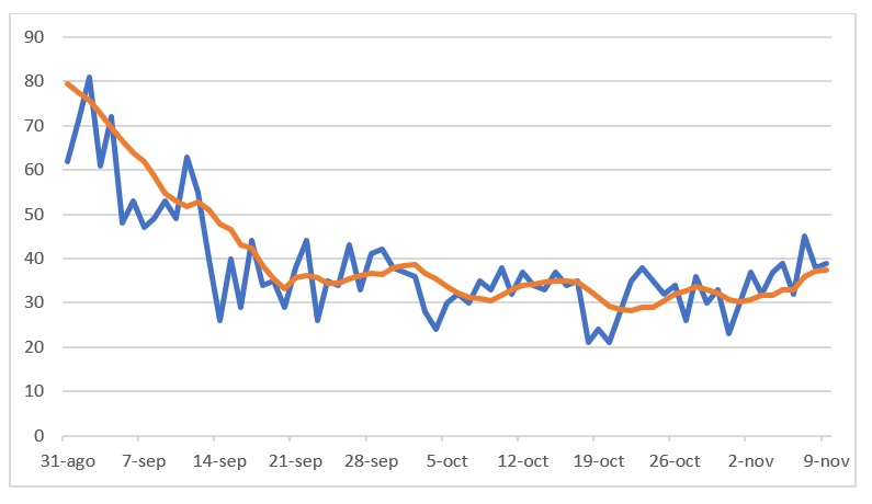Según los casos de infectados diarios calculados por promedio semanal, desde el 21 de octubre estamos en una etapa ascendente, al pasar de 1.299 el 20 de octubre, a 1.965 el 9 de noviembre. Es una tasa de crecimiento diaria del 1,8%, que todavía no es alta.