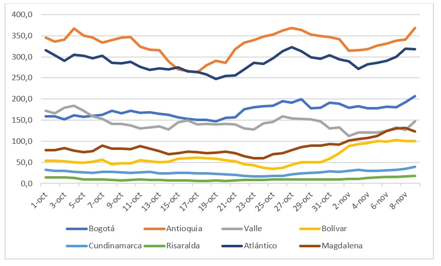 De las 33 regiones, solamente cuatro no muestran crecimientos en los contagiados diarios del 20 al 9 de noviembre, que son: Meta, Caquetá, Arauca y Vaupés. Los demás 29 territorios presentan tasas de crecimiento muy diversas. Las de mayor crecimiento son: Santander, Cesar, San Andrés, Quindío, Risaralda, Putumayo, La Guajira, Chocó, Caldas y Vichada, con tasas diarias de 3,5% a 10%.