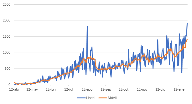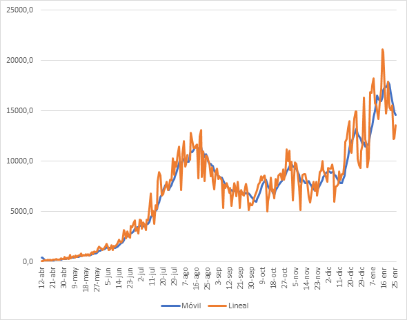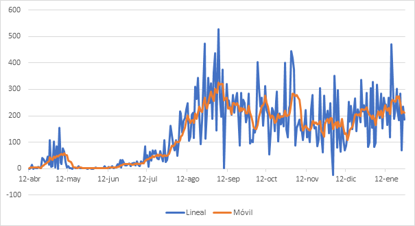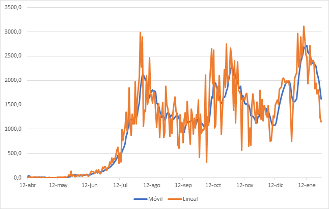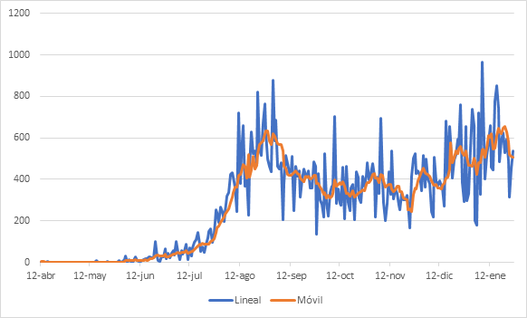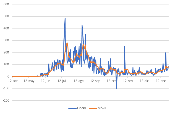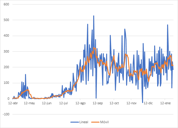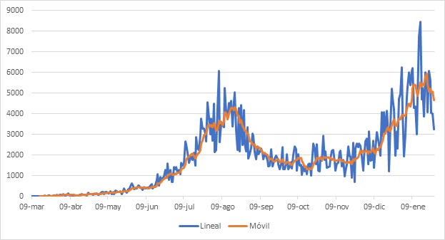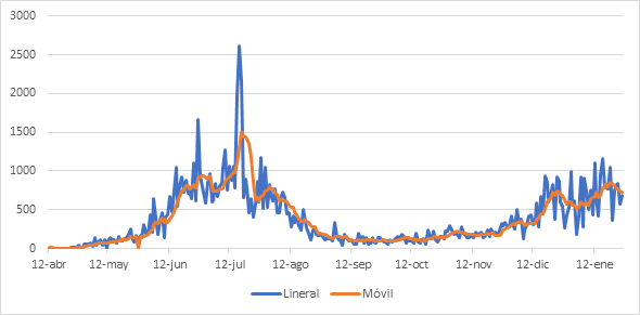 En cuanto a los casos diarios, en la gráfica 1 se presenta la evolución del Covid-19. Se ven claramente las dos olas: la primera, del 6 de marzo al 4 de octubre, y la segunda del 5 de octubre en adelante, con un máximo de 17 857 casos de promedio móvil el 20 de enero de 2021, en comparación con 11 549 del primer pico. Del 2 al 26 de enero van seis días de decrecimiento, llegando a 14 569 el 26 de enero.