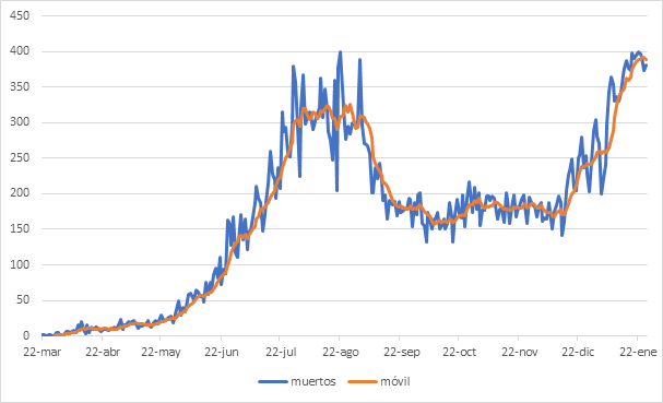 En cuanto a los muertos, han aumentado correlativamente el número de casos diarios. Hay un rezago entre el aumento de los casos y el de las muertes de cerca de una semana, por lo menos. Entonces, la disminución que se viene dando desde el 21 de enero -de infectados diarios- debe reflejarse con el tiempo en una disminución de las muertes. Estas llegaron a un máximo de 391,9 los días 24 y 25 de enero (gráfico 2).