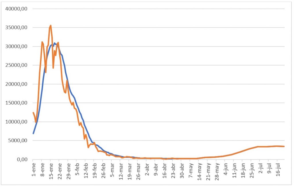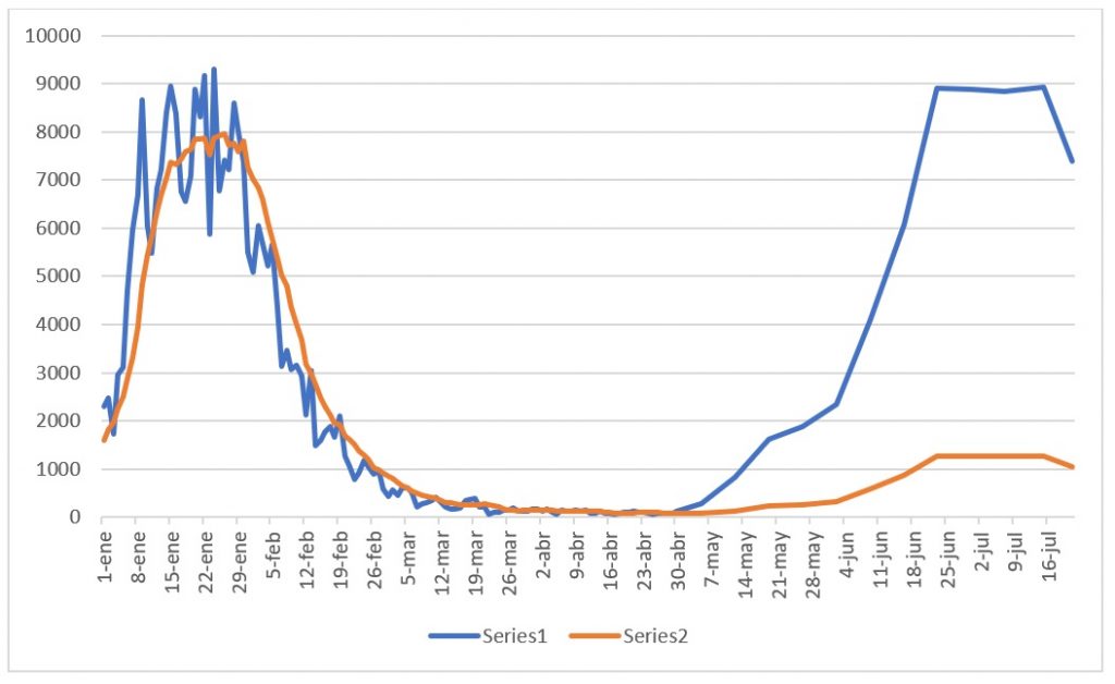 Los casos diarios pasaron de 211 infectados el 5 de mayo a un máximo de 3521 en la semana del 8 al 15 de julio y bajaron a 3446 en la semana del 16 al 21 de julio, es decir, la etapa ascendente ha durado dos meses y 10 días, aunque desde la semana del 23 al 30 de junio ha mostrado una estabilización con un promedio de 3438 infectados diarios (gráfico 1).