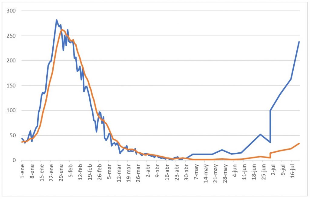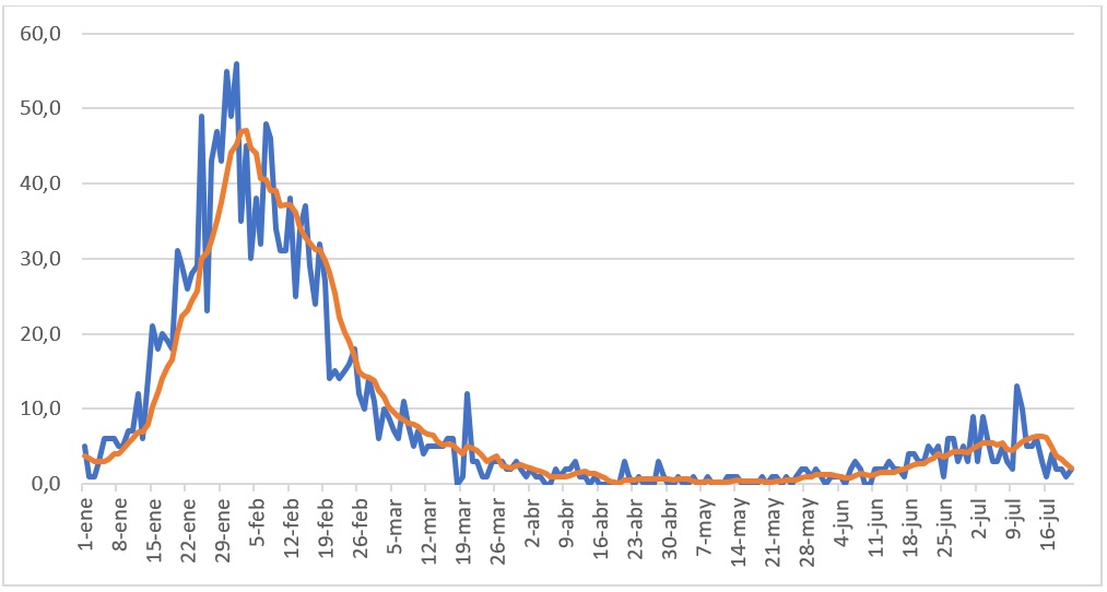 Los muertos diarios siguen subiendo desde el 20 de mayo, de 2 a 34 el 21 de julio, excepto por una caída del 5 al 19 de mayo (gráfico 2).