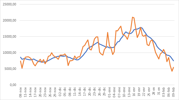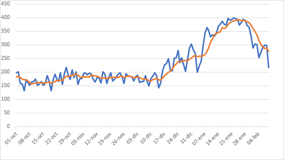 Del 20 de enero al 9 de febrero el número de infectados diarios cayó de 17 857 infectados diarios a 7472 el 9 de febrero, una reducción importante de 58,2 por ciento.