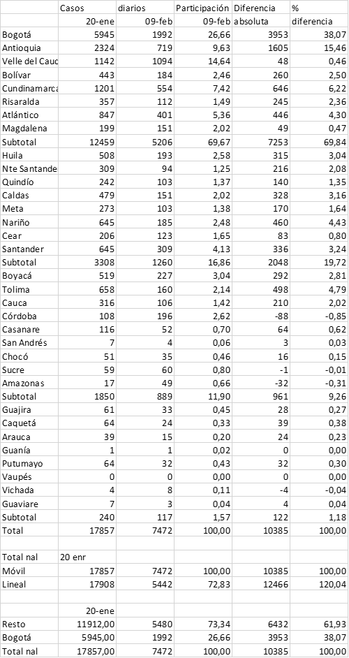 Para el día 9 de febrero, Bogotá explicaba el 26,66 por ciento de los casos diarios de infectados, seguido por Valle del Cauca con 14,24 por ciento, Antioquia con 9,6 por ciento, Cundinamarca con 7,42 por ciento y Atlántico con 5,3 por ciento. Los demás departamentos tenían participaciones inferiores a 5 por ciento.