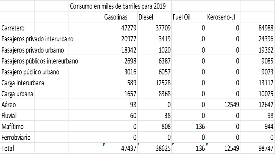 De un total de consumo final de 98 747 miles de barrilles en 2019, 13 689 se consumieron en los sectores aéreo, fluvial y marítimo, el 13,9%.
