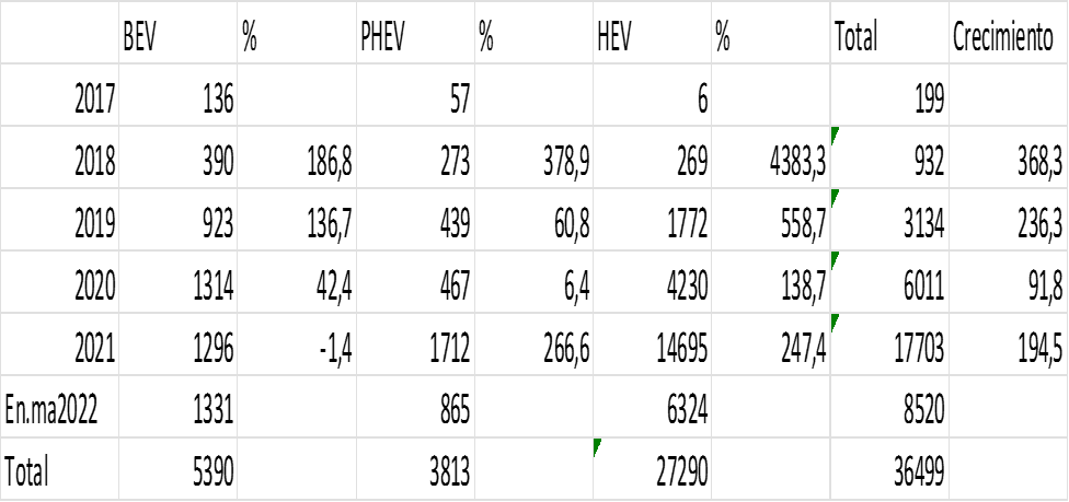 Hay otra información de la revista Motor que se muestra en el cuadro 2, sobre el registro anual de los carros híbridos y eléctricos de 2018 al primer trimestre de 2022, que no coincide con la cifra del. ministerio de Transporte para 2019, pro que suministra una información valiosa sobre el stock de vehículos por tipo.