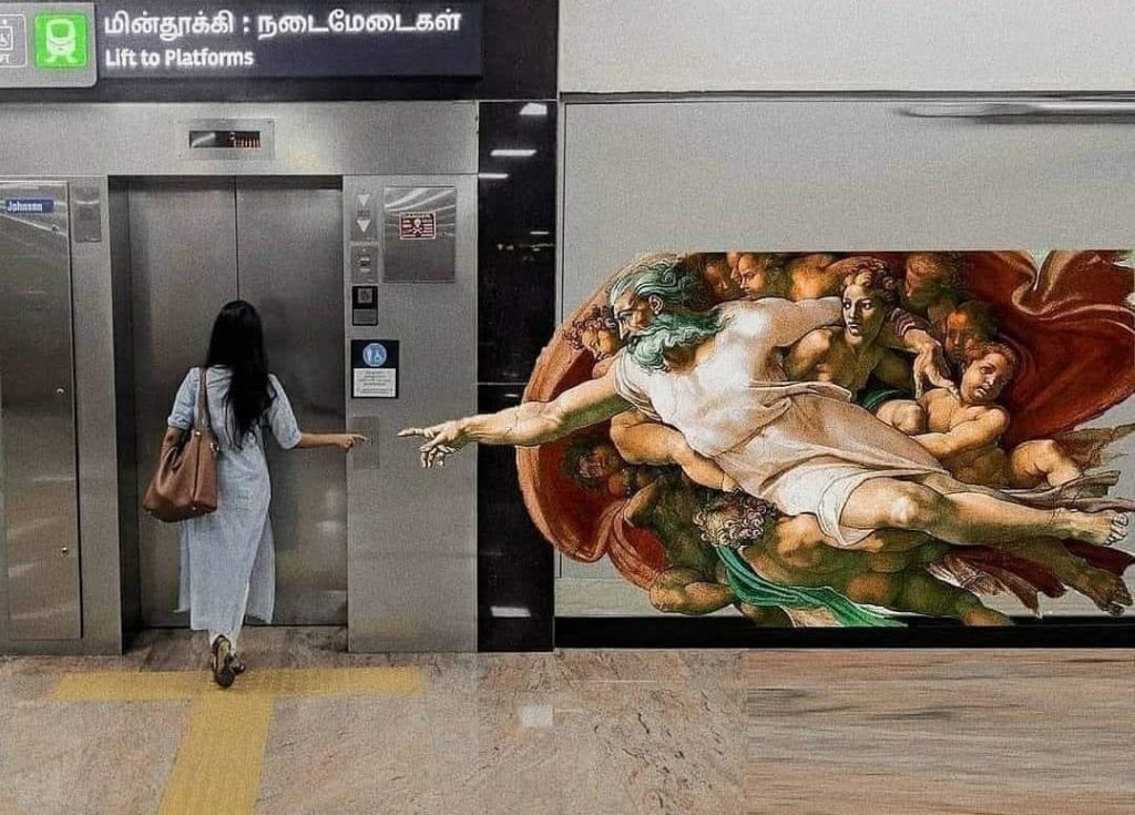 Miguel Ángel consiguió el nacimiento en los hombres de la idea de un dios cercano: un dios que tiende su mano con el objetivo de darles vida a los hombres. Por eso acercó las manos de la deidad y del hombre de carne y hueso, como nunca se había hecho en el arte, para dar a entender que a partir de esta proximidad la vida fluiría para siempre. O sea que es nuestro maestro renacentista el que ha tendido la mano de ese dios para que le indique a esta mujer dónde se encuentra el botón que la llevará al edén: ella, como lo veis, le da la espalda a quien se ha autonombrado como supremo. En este caso, con seguridad que ese paraíso anhelado se encuentra en una oficina donde ella dejó de ser Eva, abandonando la maldición de depender toda la vida del hombre, para convertirse en una mujer plena que puede compartir su vida con un hombre o una mujer, pero sin estar nunca subordinada a su pareja.