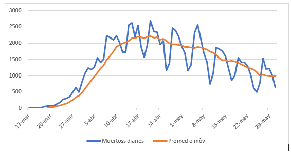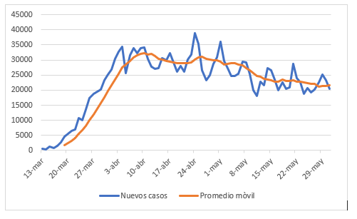 Esto va contra la opinión generaliza que en los Estados Unidos se está en una grave situación desbordada del Covid-19. Las cifras muestras que esto no es así, que en el país del Norte se está en la etapa del quiebre. Efectivamente los nuevos casos que eran de 30 000 y más ya han bajado a valores de 20 000. Y las muertes diarias, que llegaron hasta más de 2600 casos, a partir de mayo se redujeron a menos de 2000 y el 31 de mayo fueron 637.
