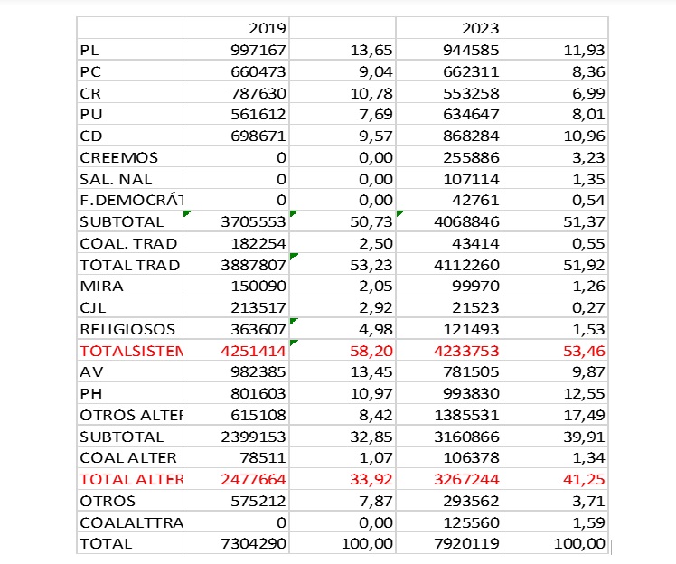 Los partidos del sistema, los tradicionales y los religiosos cayeron de 58,20% en 2019 a 53,46% en 2023.
