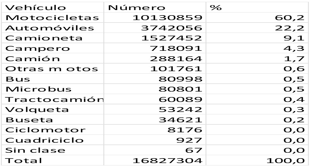 Según el ministerio de Transporte, en 2021 había un total de 16’827.306 vehículos, de los cuales los automóviles eran 3’742.056, motos 10’130.859, camionetas 1’527.452 y camperos 718.091, de los vehículos más numerosos (cuadro 1).