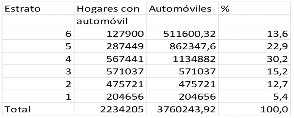 Los hogares del estrato 6 explican el 13,6% de todos los automóviles, o sea, que el automóvil no es exclusivo de este estrato como se afirma sin pruebas estadísticas, con el propósito de defender a la brava una política impopular y equivocada. El estrato medio es el que tiene el mayor porcentaje de automóviles con 30,2% y los estratos bajos (1, 2 y 3) representan el 33,3%. O sea, el automóvil está en todos los estratos, y un incremento desfavorece a la mayoría de los hogares medios y bajos que son el 63,5%.