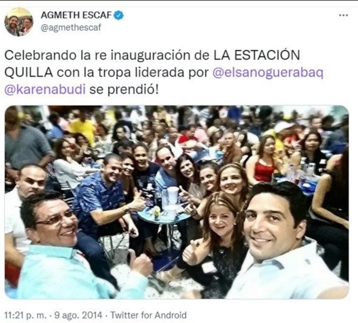 Si se me permite meter la cucharada, solo para mostrar por dónde va el agua al molino traigo a colación algunas fotos que publiqué en mi muro de Facebook por los días de la columna citada, las cuales dan cuenta de la cercanía de Escaf con el clan Char: una donde le dice a Elsa Noguera “qué orgullo recibir de tus manos la bandera de la tierra prometida”, otra donde abraza a Álex Char y le dice “mi llave @alejandrocharch”, y una tercera donde anuncia que “por el amor que le tengo a mi tierra prometida, porque me emociona ver lo bonita que está, lo bien que va, el domingo votaré por Álex Char”. (Ver fotos y trinos).