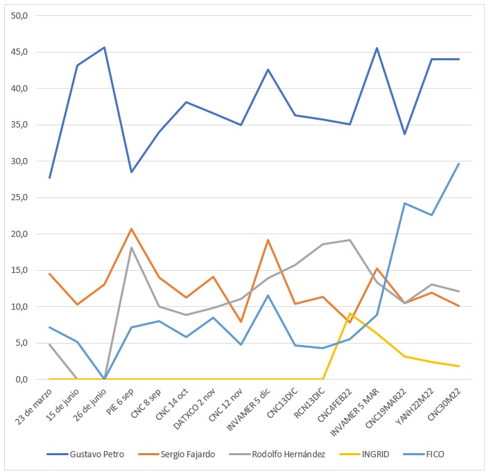 En el gráfico 1 se presenta la evolución de las encuestas teniendo en cuenta la votación neta, después de descontar voto en blanco, NS/NR y ninguno.