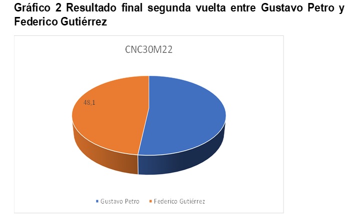 En la gráfica 2 se muestra el resultado de una final presidencial entre Gustavo Petro y el candidato de la derecha, Federico Gutiérrez, en que gana el senador 51,9% contra 48%.