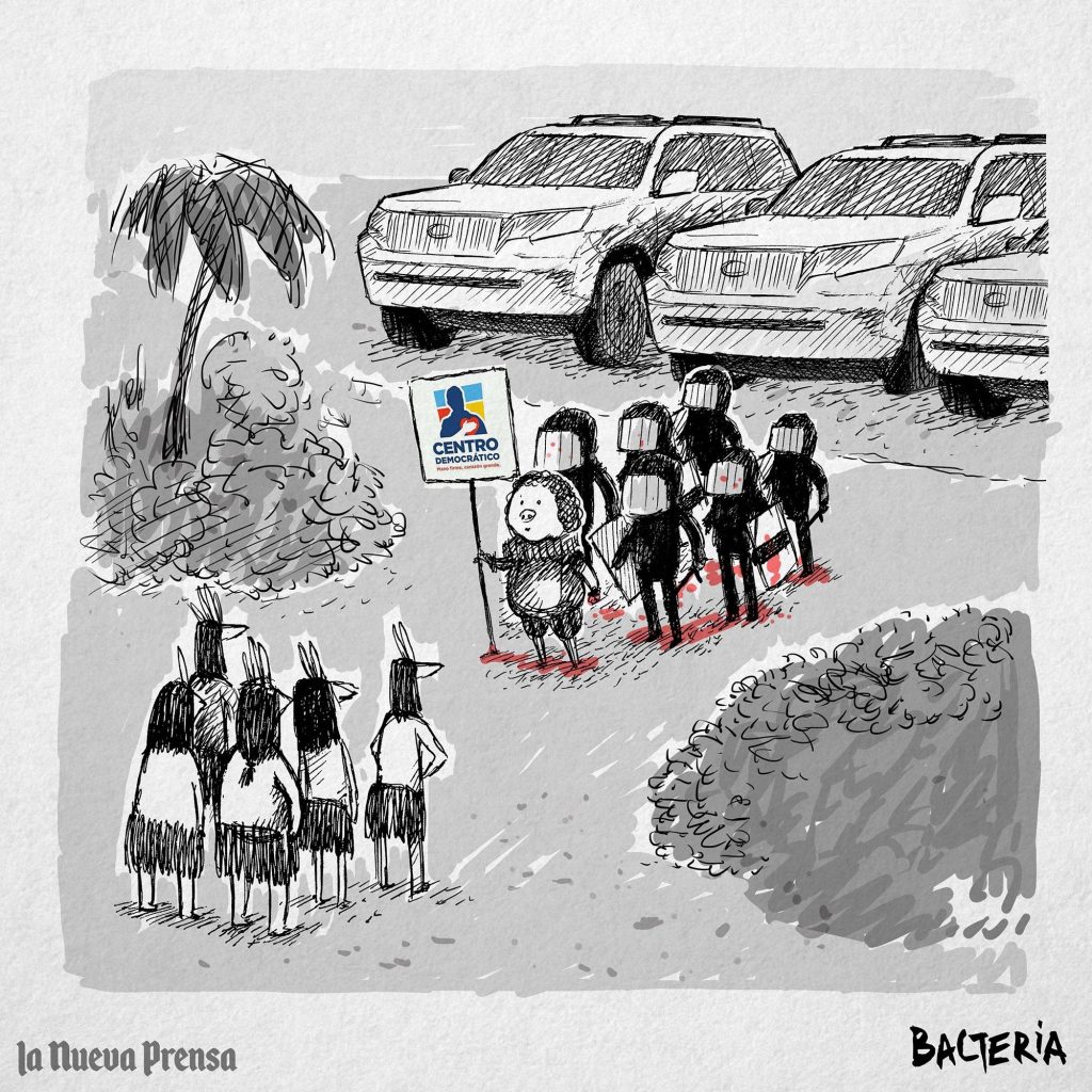 El Duque y su gente de bien quieren culminar la labor que el Soberano inició años atrás: refundar la patria desde el narco paramilitarismo. La bandera que enarbolan es la bandera de la barbarie. Y se comportan hoy como si fueran los conquistadores de siglos atrás. Ven a las comunidades indígenas con el exotismo de los museos, con la indiferencia de su supuesta superioridad cultural, como a nativos salvajes y no como a ciudadanos sujetos de derecho. Ven a los ciudadanos como peones de su juego político: son importantes en la medida en que sus acciones sean estáticas, apolíticas, en la medida en que rían y aplaudan las piruetas del Duque y se alimenten sin protestar del espectáculo circense en que los medios de comunicación han convertido el ejercicio de la crítica política.