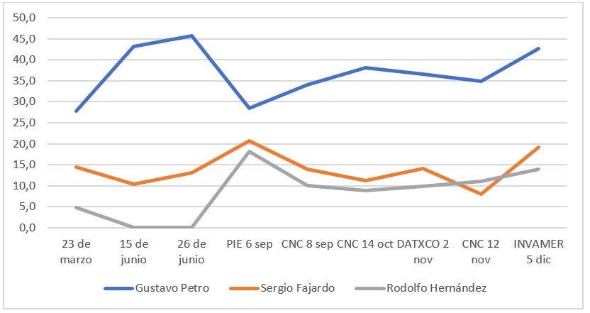 Allí se aprecia cómo Gustado Petro siempre ha estado por encima de los demás contrincantes, con una opinión que votaría por él entre el 30% y 45%.