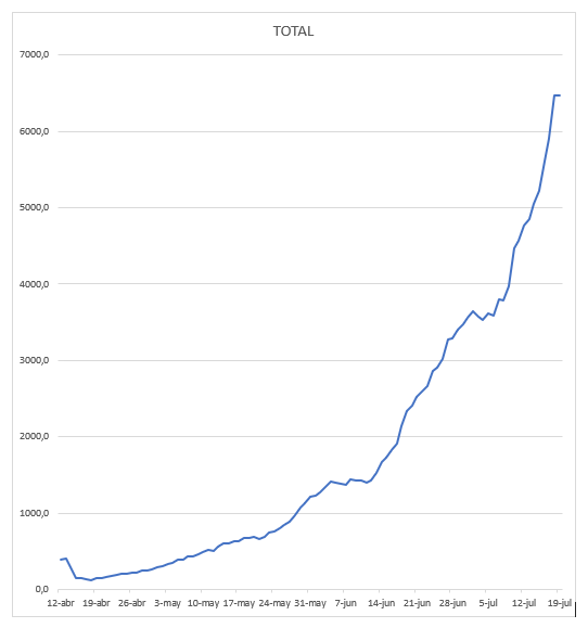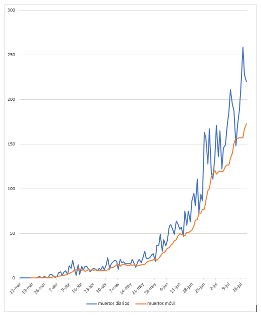 En cuanto a las muertes, se pasó de un promedio diario lineal de 177,6 en la semana del 6 al 12 de julio a 204,1 en la semana del del 13 al 19 de julio, un incremento diario promedio de 2,0%. El 10 de julio por primera vez se pasó la barrera de los 200 muertos diarios, pero del 11 al 15 de julio se bajó menos de 200. El 16 de julio se saltó a 215 muertes, el 17 a 259, el 18 a 228 y el 19 a 220.