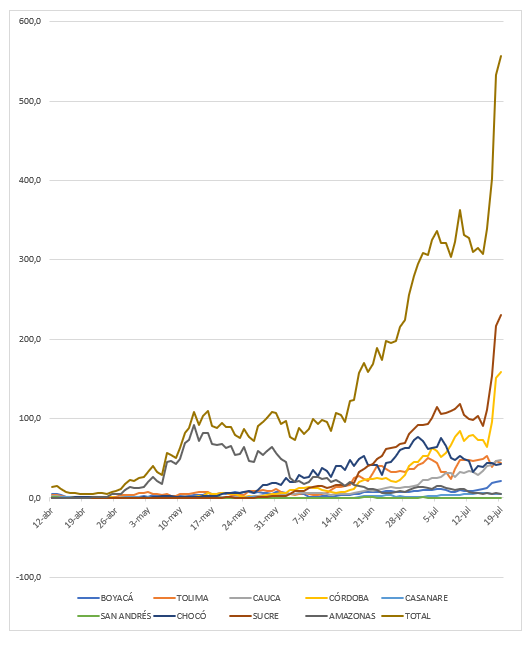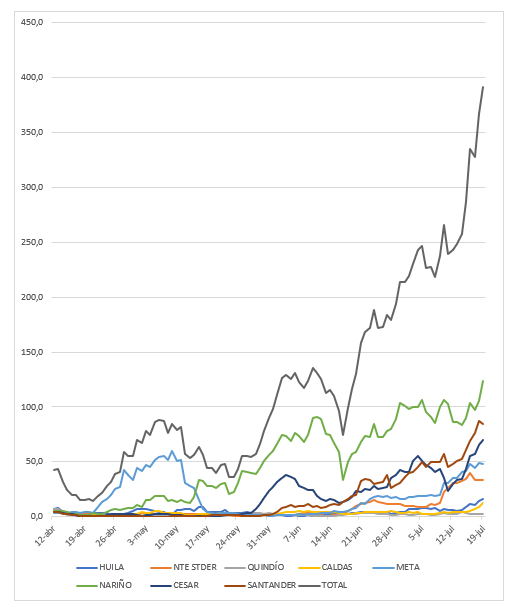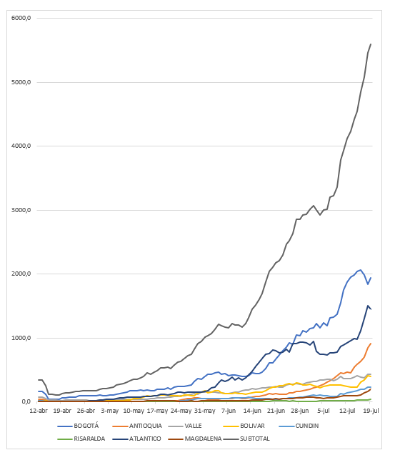 La semana del 13 al 19 de julio fue de fuertes cambios en relación con la semana anterior. El promedio de casos nuevos fue 5614,9 en comparación con 4815,0 (para un crecimiento diario de 2,36%). Se dio un salto a más de 8000 casos nuevos los días 16, 17 y 18 de julio, una cifra altísima, no solamente con respecto a Colombia sino con relación a la experiencia internacional, cifra que han superado muy pocos países, entre ellos Brasil, India, Sur África, Estados Unidos y Rusia, y pare de contar. Ni siquiera España, Italia y Francia llegaron a estos valores.