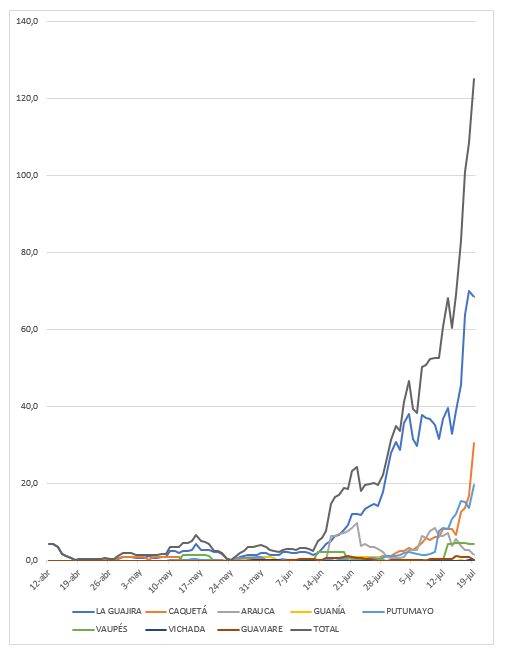 Gráfica 5 Evolución de casos nuevos en La Guajira, Caquetá, Arauca, Guainía, Putumayo, Vaupés, Vichada y, Guaviare