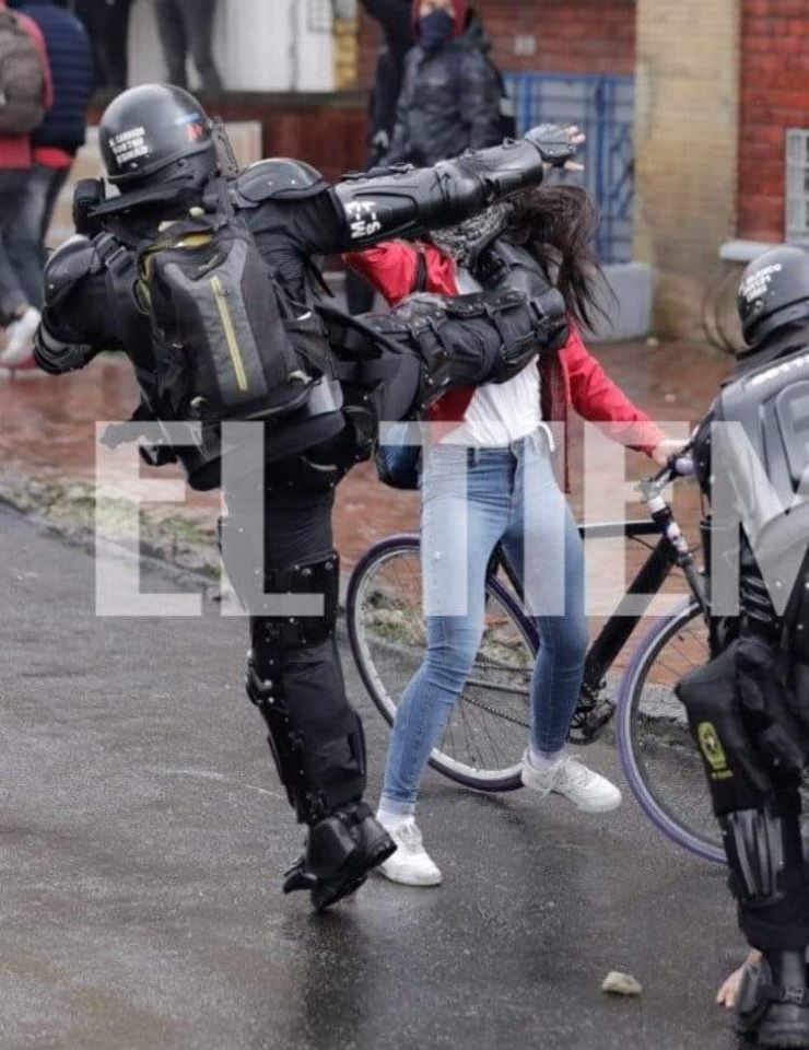 La joven se baja de su bicicleta y se pone un pañuelo en la boca para protegerse de los gases. Aparece el policía del Esmad y le da tremenda patada en la cara. Enseguida llegan otros a «ayudar» a golpearla.