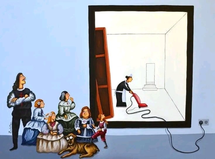 Muy emocionada entré casi corriendo a mi gran cita con el arte. Al llegar a la mundialmente famosa obra, quedé de una pieza: el cuadro estaba completamente en blanco. Sus personajes principales, la infanta Margarita, su corte, el perro y Velázquez, estaban fuera de él. Se encontraban al lado, esperando, con mucha calma, que la señora de la limpieza del museo aspirara el polvo acumulado durante casi cuatro siglos. Ninguno de los protagonistas de la pintura decía nada y tampoco dejaban entrever alguna sensación de disgusto. Esperaban en silencio y muy ordenadamente, sin generar ningún estropicio en la sala, a que la señora cumpliera con su cometido. Quise hablar con el maestro, pero estaba completamente estático y mudo. ¡Claro, estaba pintado!