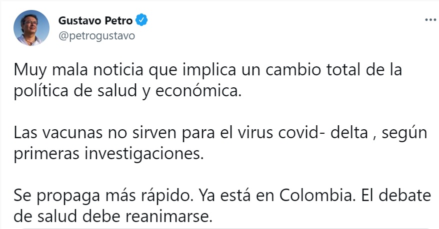Petro tiene razón en llamar la atención sobre la mayor peligrosidad de la variante Delta y en reabrir la deliberación pública sobre las medidas a tomar. Pero su redacción descuidada, donde la precisión es fundamental, termina desviando la discusión hacia una batalla tuitera de sectarismos y odios políticos, en vez de lograr que se profundice en el asunto verdaderamente importante: cómo salvaguardar la salud de los colombianos en una situación que literalmente es de vida o muerte.
