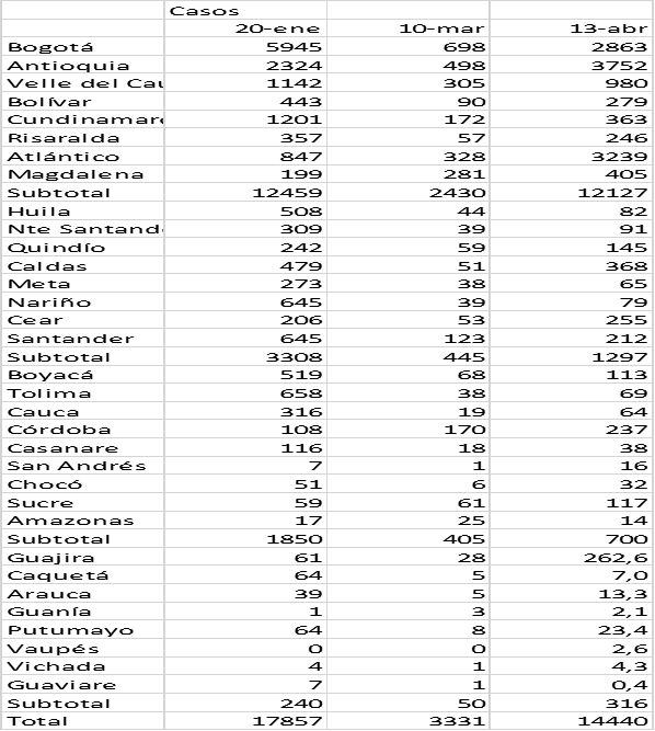 No obstante, Bogotá, Antioquia y Atlántico, con 9854 infectados el 13 de abril, explicaban el 68,2 por ciento del total. Con Valle del Cauca, la cifra crece 10 834 y el 75,0 por ciento, un porcentaje muy alto.
