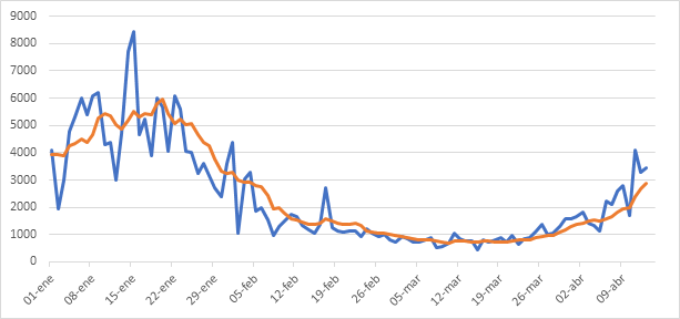 Los muertos diarios crecieron del 6 al 13 de abril, de 181 a 279, un incremento alto de 54,1 por ciento, en comparación con el pico de la segunda ola que fue de 392 muertos los días 24 y 25 de enero.