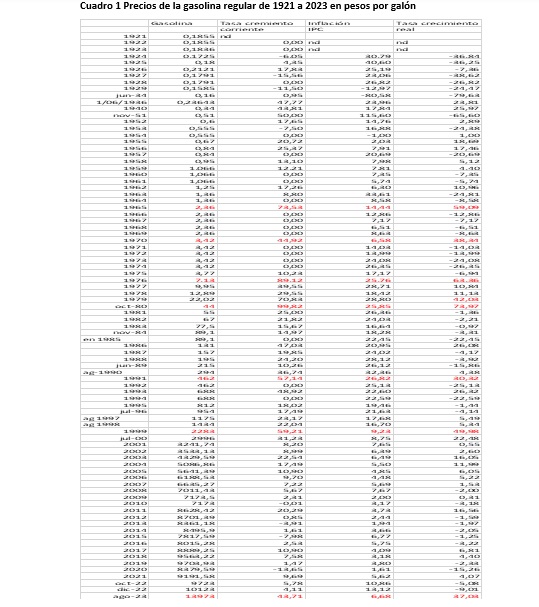 Cuadro 1 Precios de la gasolina regular de 1921 a 2023 en pesos por galón