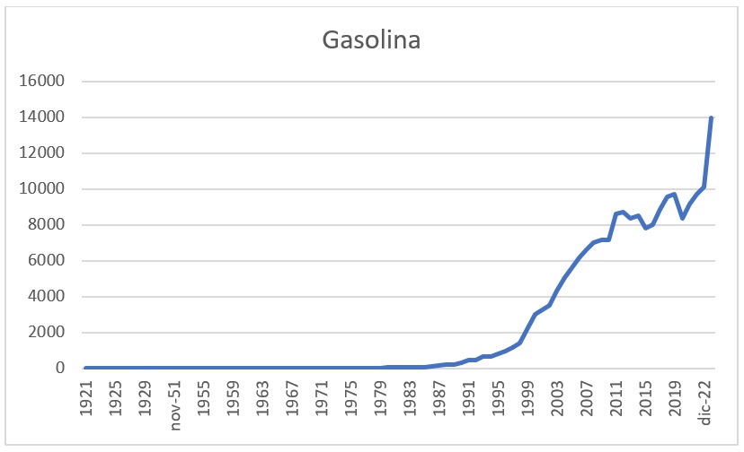 Gráfico 1 Precio de la gasolina corriente en pesos por galón de 1921 a 2023