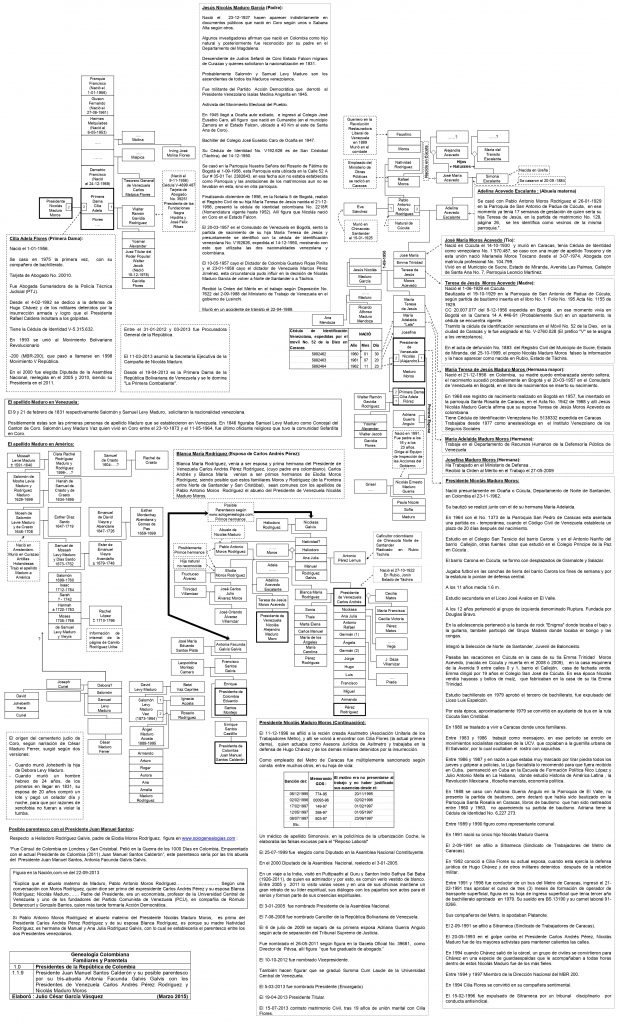 Siempre ha existido la duda sobre el verdadero lugar de nacimiento de Nicolás Maduro. Su árbol genealógico probaría que nació en Colombia, pese a que él siempre ha asegurado que creció en los barrios de Caracas. Consultamos a Julio César García, presidente de la Academia Colombiana de Genealogía, quien nos mostró el árbol genealógico del presidente de Venezuela y estas fueron sus conclusiones.