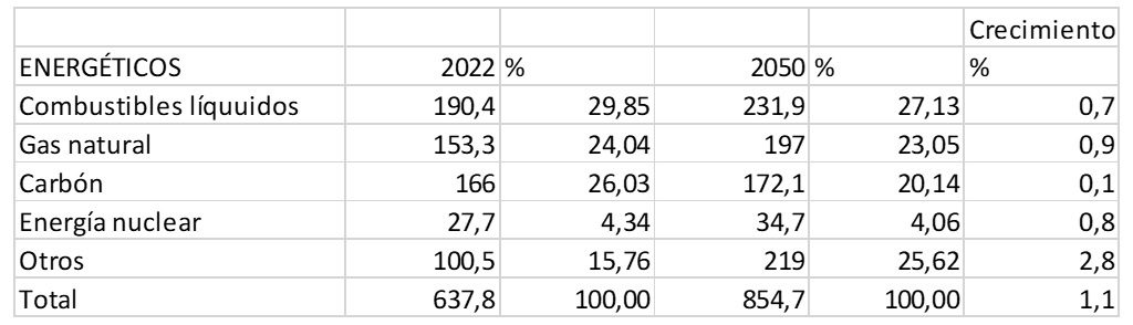 En el cuadro 1 se presentan las proyecciones mundiales a 2050 del consumo de energía primaria desagregado por combustibles líquidos, gas natural, carbón, energía nuclear y otros que incluye energías solar, eólica, hidroeléctrica y varios.