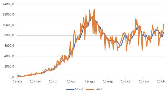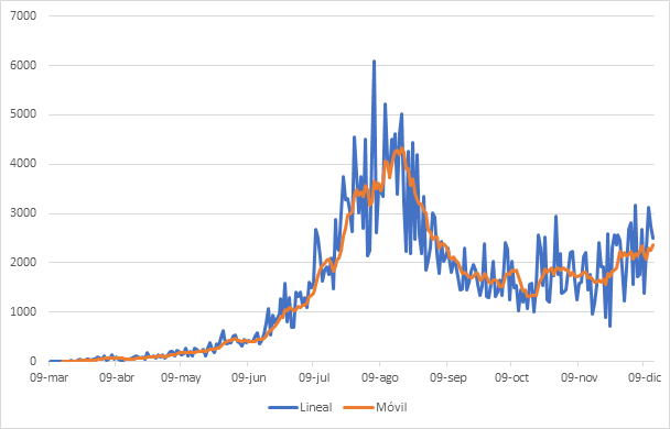 En cuanto a Bogotá, alcanzó al pico de casos diarios el 19 de agosto con 4318 infectados según promedio móvil de siete días y desde este día llegó a un mínimo de 1504 el 3 de octubre. Desde el 4 de octubre mostró una tendencia a aumentar superando los 2000 casos diarios el 27 de noviembre, hasta llegar a 2587 el 15 de diciembre. Ha sido un rebrote no muy fuerte, muy por debajo del máximo alcanzado el 19 de agosto. ¿Qué puede pasar en el futuro? Nadie lo saba sabe, solo suposiciones. Si se afloja la disciplina en las fiestas que comienzan el 16 de diciembre y que van hasta el 6 de enero, existe la posibilidad de que aumenten los infectados. Y se sobrepase la barrera de los 3000 contagiados diarios.