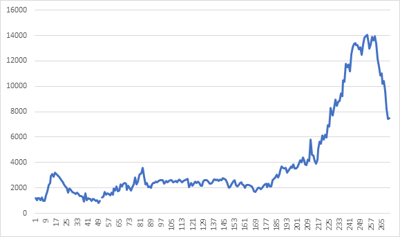 Las muertes diarias solamente disminuirán de 180 cuando los casos diarios de contagiaos estén por debajo de 6000 ya que la tasa de letalidad se encuentra cerca de 2,7%.