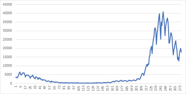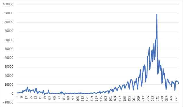 En una pandemia, al comienzo la curva de casos diarios es suave y llega un momento en que crece exponencialmente, alcanza un pico y comienza a descender. Esta curva tiene una forma de campana asimétrica porque la parte descendente es más alargada que la ascendente. Al inicio los casos diarios aumentan y luego disminuyen a cifras que deberían estar por debajo de 100, cuando la pandemia se ha controlado.