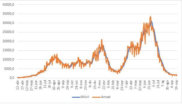 Los casos diarios siguen cayendo lentamente, de 1648 de promedio de siete días en la semana del 8 al 14 de septiembre a 1518 del 15 al 21 de septiembre, con una tendencia hacia un aplanamiento, pero que parece todavía va a durar un tiempo hasta llegar a un mínimo (gráfico 2).