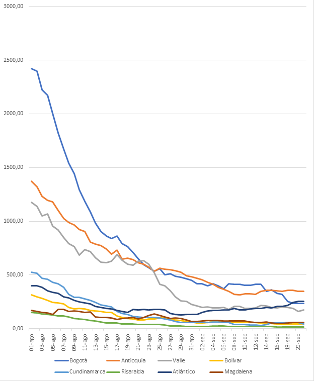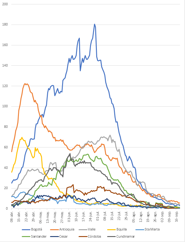 Sobresale la dinámica en Bogotá, que es lo que ha hecho disminuir fuertemente los infectados y muertos diarios. Para el 21 de septiembre eran de 235 y 4 respectivamente, cuando habían estado en máximos de 10.527 el 30 de junio y de 181 el 28 de junio, una reducción extraordinaria.