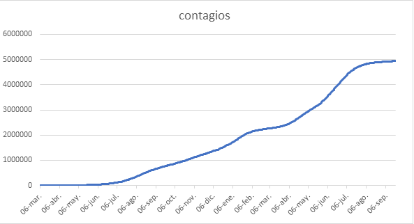 El total de infectados se está acercando lentamente a 5 millones, ya para el 21 de septiembre se tenían 4.943.622, con crecimientos diarios alrededor de un promedio de 1500 (gráfico 1).