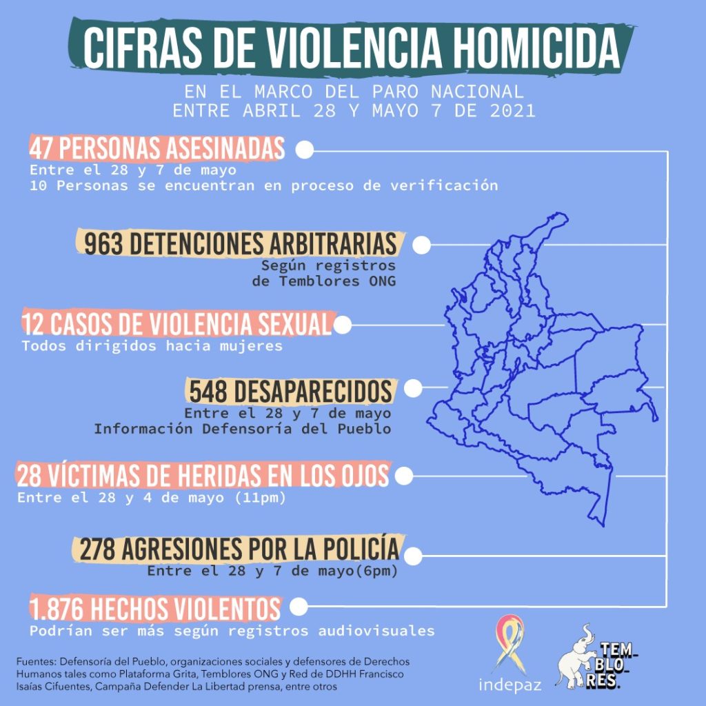 El Instituto de Estudios para el Desarrollo y la Paz (Indepaz) y la ONG Temblores publicaron un comunicado conjunto sobre las cifras de violencia y asesinatos ocurridos durante el paro nacional que se inició el pasado 28 de abril. Los datos son alarmantes y están actualizados hasta el 9 de mayo.